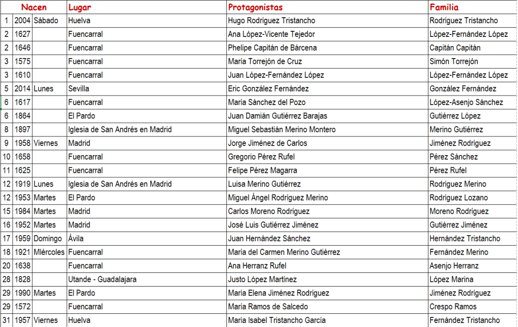 Los nacimientos en Mayo: Estos son los que tengo de momento grabados en mi hoja de cálculo, voy consiguiendo más pero ya los iré incorporando poco a poco, mientras pueda, claro.