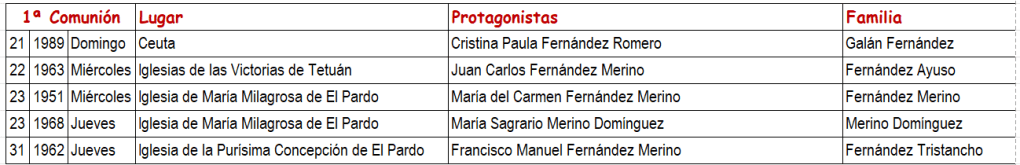 Las comuniones en Mayo: Es evidente que gran parte de mis ascendientes hicieron la primera comunión, y casi siempre se hacía en mayo, pero, son los datos que menos tengo incorporados en mis estudios. No se suelen incluir en los datos de árboles genealógicos de momento; he recuperado algunos, pero muy pocos.