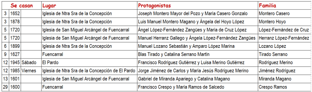 Los casamientos en Mayo: Son bastantes los que voy recuperando, la gran mayoría sobre las familias de Fuencarral, al igual que los bautizos en la parroquia de San Miguel Arcángel de Fuencarral.