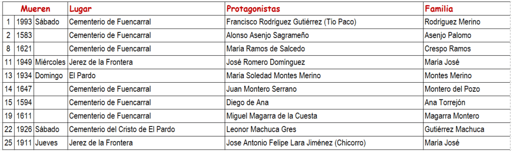 Los fallecimientos en Mayo: En este aspecto también tengo pocos datos aún, y en muchos casos, solo el año.