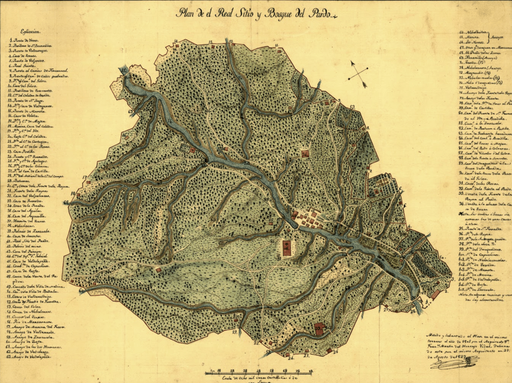 Este plano, delineado y con las anotaciones a mano del Parque es de principios del siglo XIX, me parece una verdadera joya, incluso en la señalización del norte y en la escala que está en varas castellanas, donde relaciona 8.000 varas con una legua. En él se indica la ubicación de las puestas y construcciones del espacio con números.