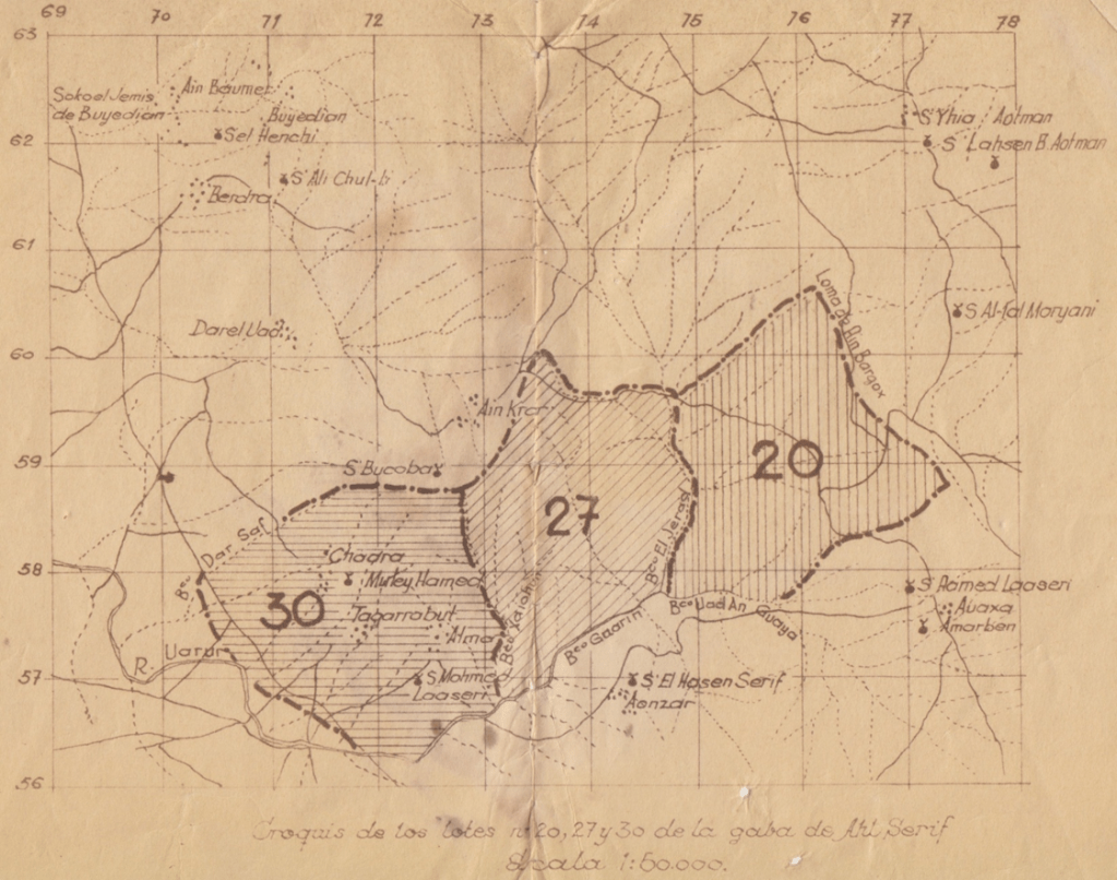 Los lotes 20, 27 y 30, adjudicados a mi padre estaban en la misma ladera, en el radio espiritual directo de este morabito. La gente de los aduares que aparecen en el croquis: Chadra, Alma, Bou Dar Saf, Bou Gaarin, Aonzar…, subían al santuario como parte de su vida normal, participaba en las peregrinaciones y vivía bajo la protección simbólica del santo. Mi padre y otros familiares que se buscaban la vida junto a él, trabajaron en un territorio donde este morabito era la brújula espiritual y social de sus habitantes.